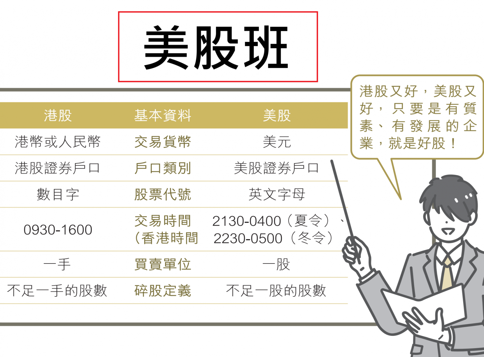 美股班(環球美股實戰班)是2025年才開辦的新課程,核心內容是美股投資技巧,並教授各種環球投資工具,課程以實戰為主,利用多種選股法及掌握大趨勢,尋找潛力美股,並教學員利用經濟數據、企業財務數據、年報,分析大環境及企業情況,判斷買賣時機及制定入市策略。